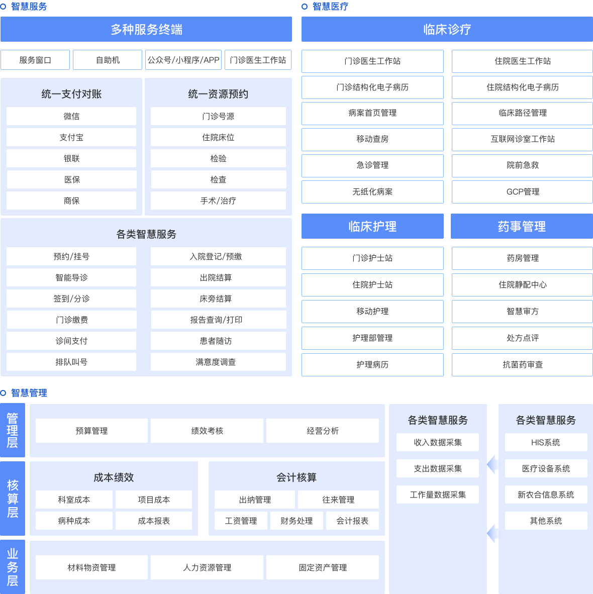 涵蓋一體化醫生工作站、一體化護士工作站、結構化電子病歷、臨床移動醫護、質控管理、醫院績效考核管理等系統功能,全面滿足醫院信息化建設需求。