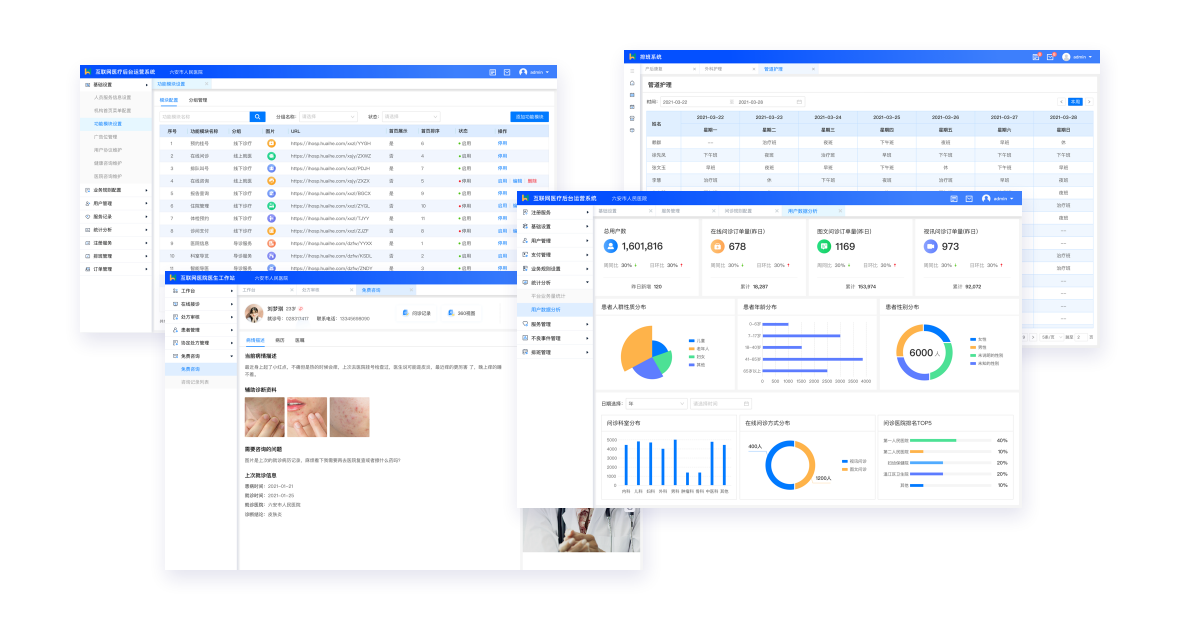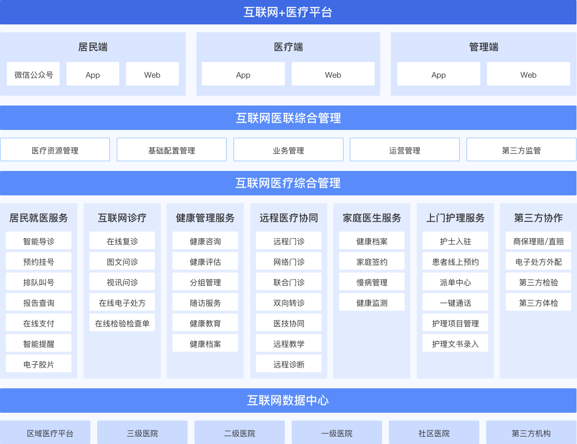 支撐醫院綜合運營和線上業務監管,滿足互聯網醫院、遠程醫療協同、家庭醫生、健康管理等領域的業務場景。